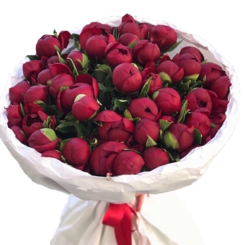 Букет состоит из 45 пионов, крафт, атласная лента.