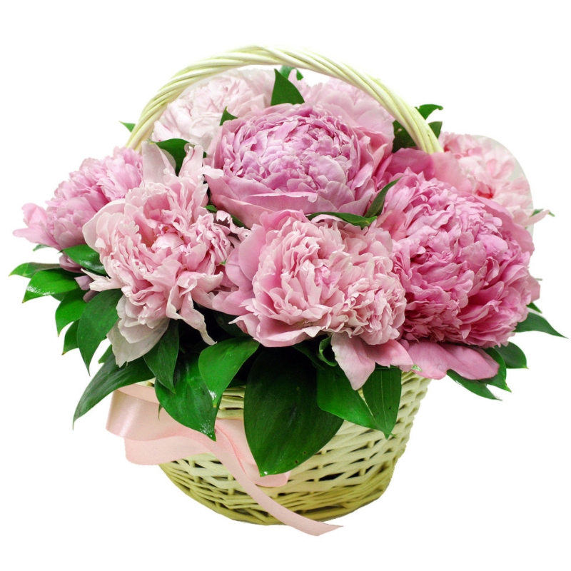 Букет состоит из 9 розовых пионов, зелень, корзина, оазис.