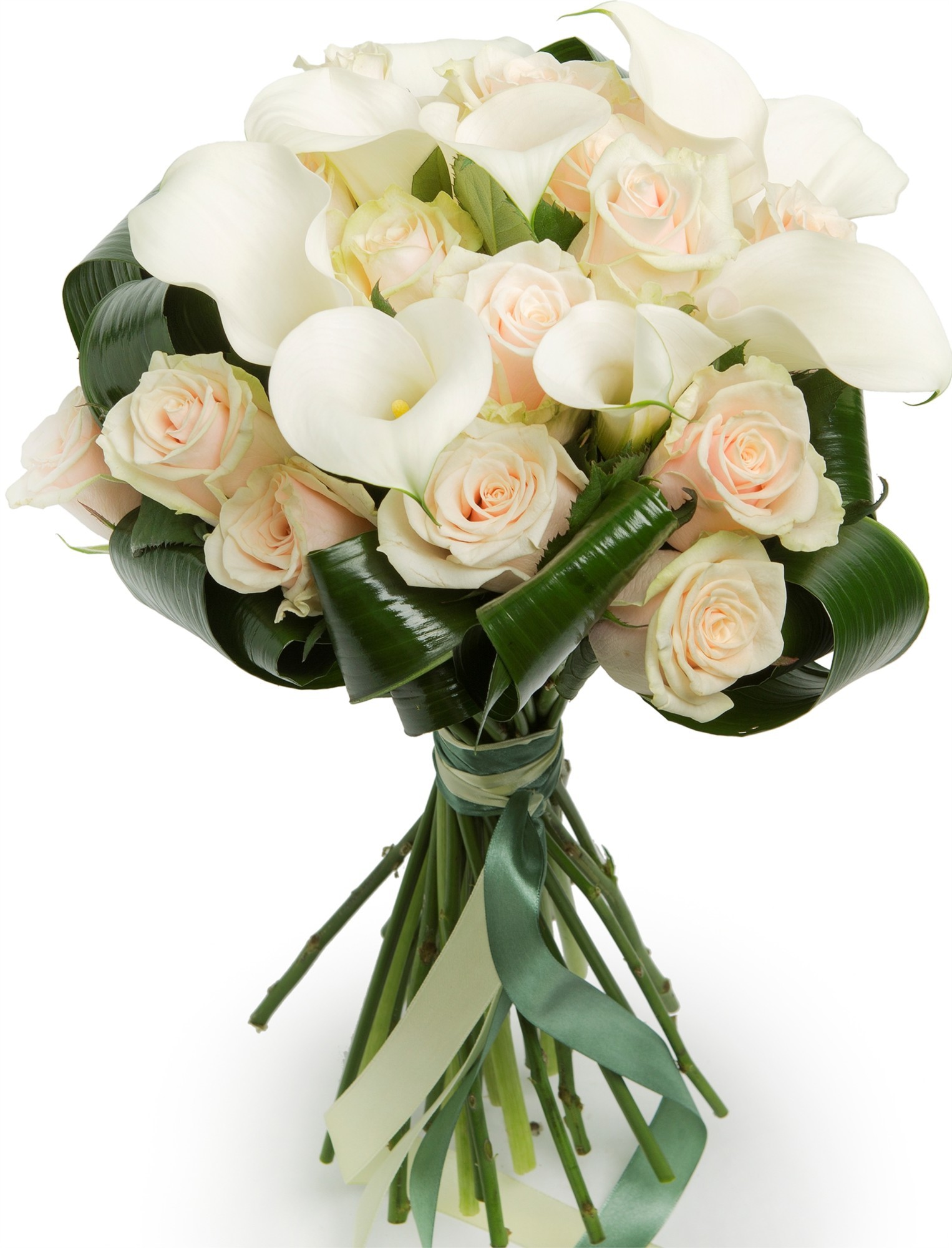 Букет состоит из 16 кремовых роз, 9 белых калл, аспидистра, прозрачная упаковка, атласная лента.