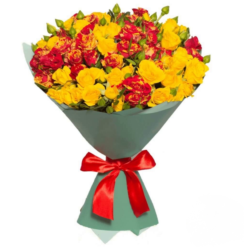 Букет состоит из MIX из 21 желтой и красной кустовой розы, красивая упаковка, атласная лента.